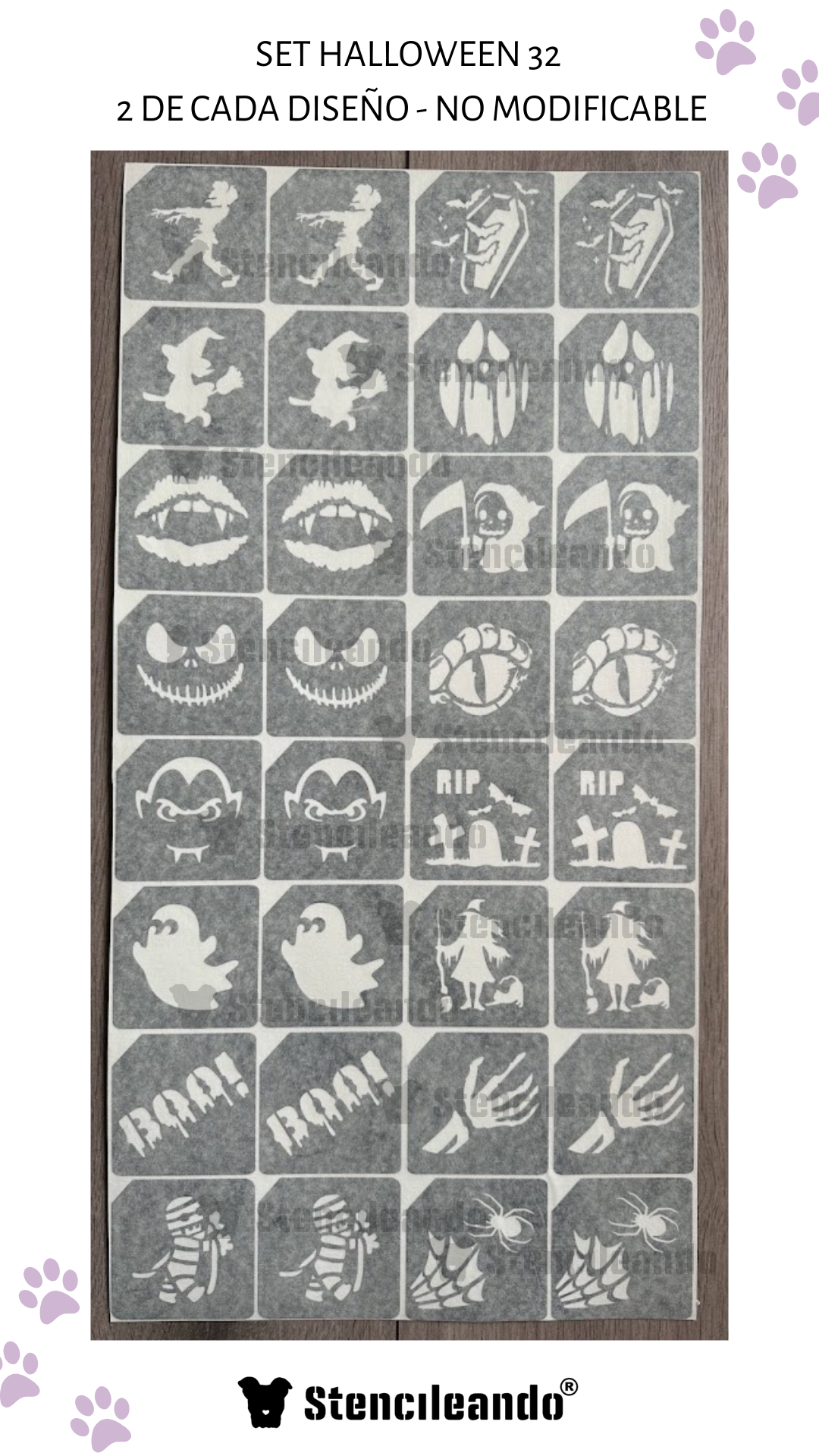 Cada set trae 32 unidades de 7x7cm, 2 stencils de cada diseño.
