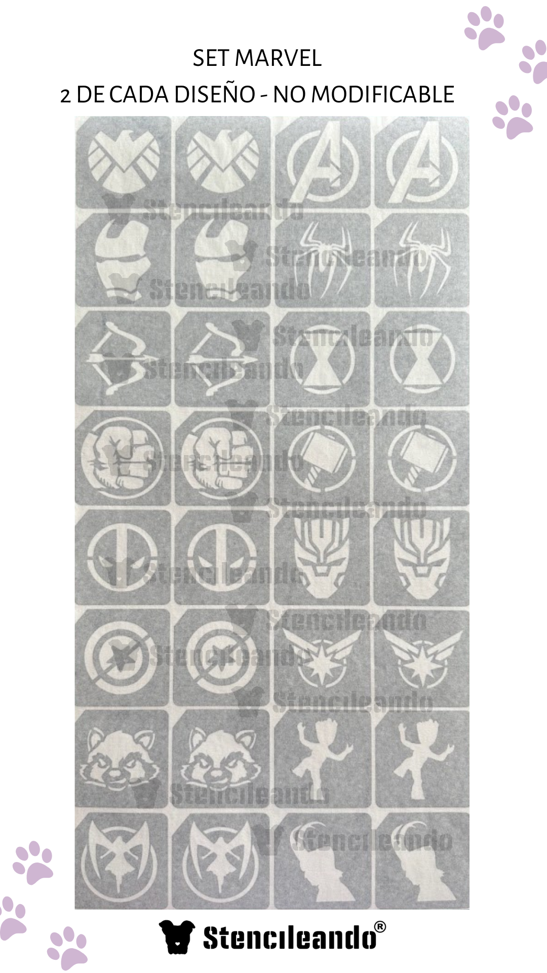 Cada set trae 32 unidades de 7x7cm, son 4 stencils de cada diseño.