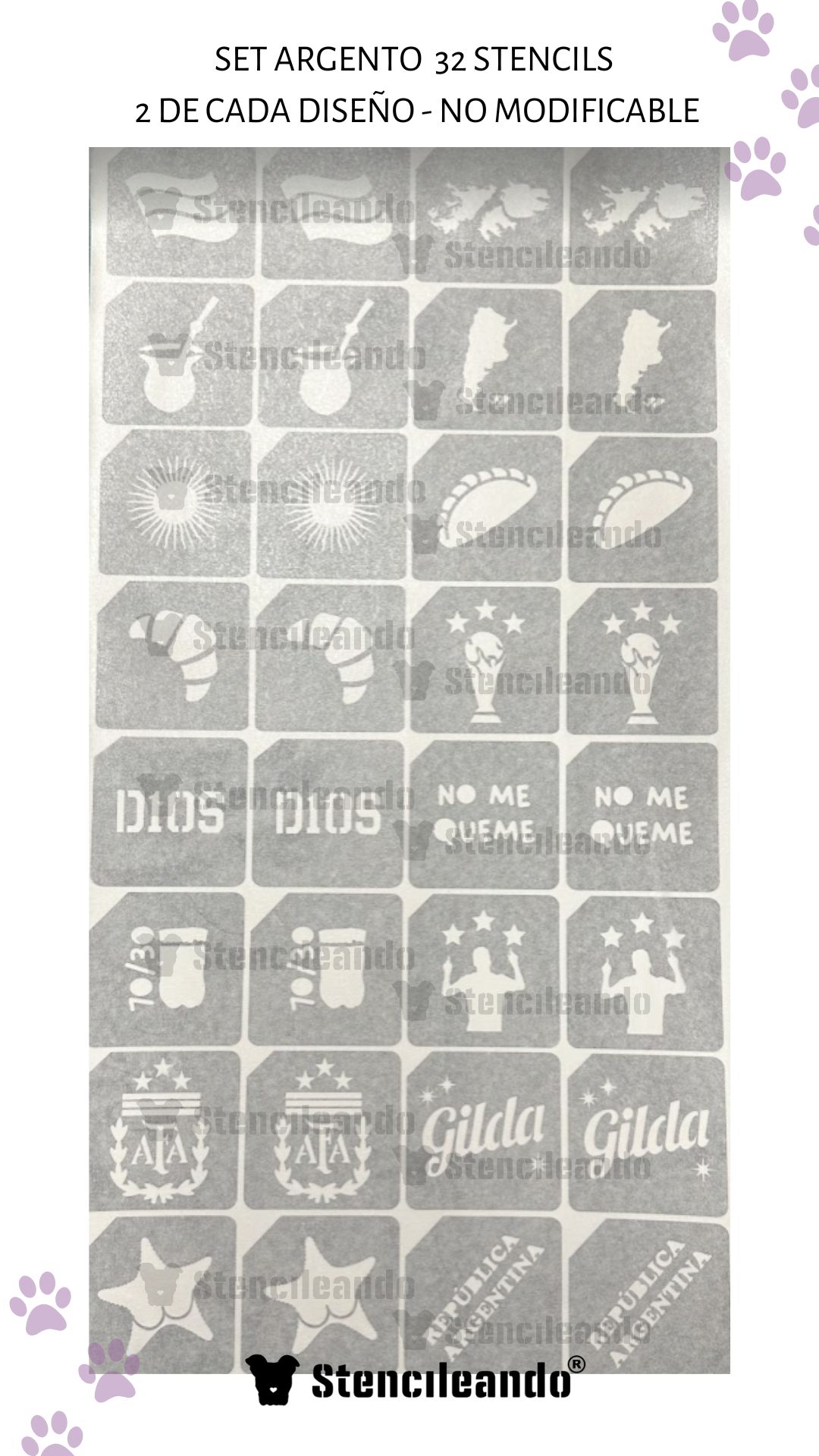 Cada set trae 32 de stencil adhesivos de 7x7cm, 4 stencils de cada diseño.